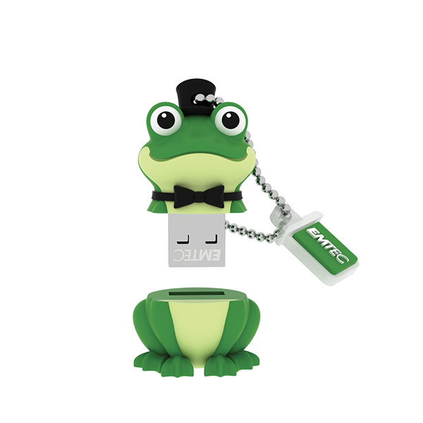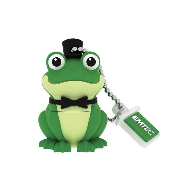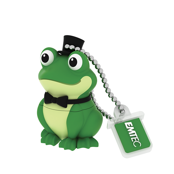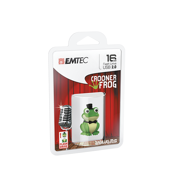16GB EMTEC USB 2.0 FLASH DRIVE CROONER FROG të Animalitos Family, i njohur si këngëtari me kapele. Model M339, produkt ekskluziv 3D, prodhuar me gomë të cilësisë së lartë. Ka sistem mbajtje për të mos lejuar humbjen e trupit.
