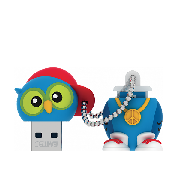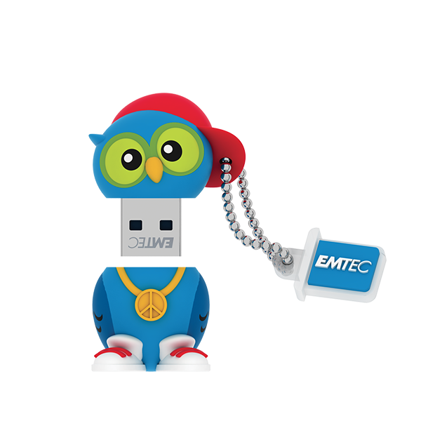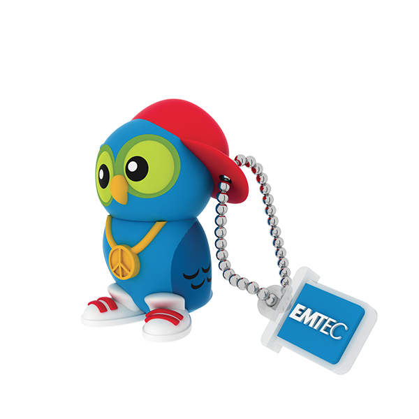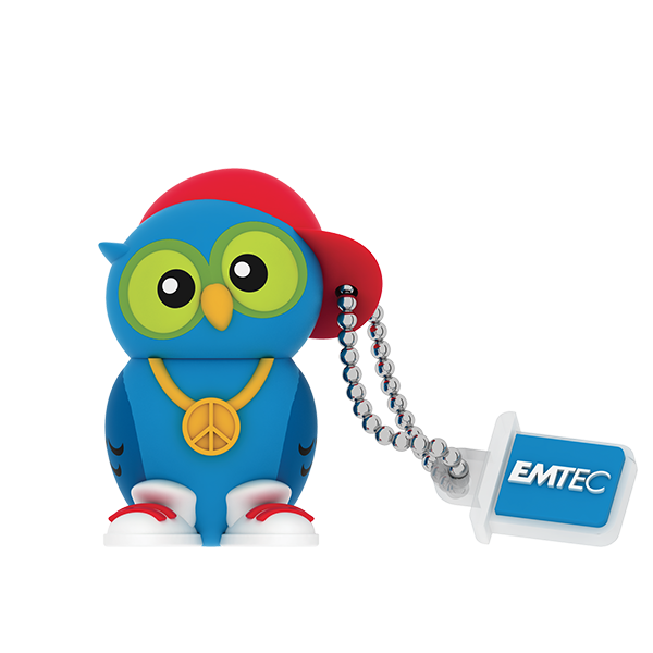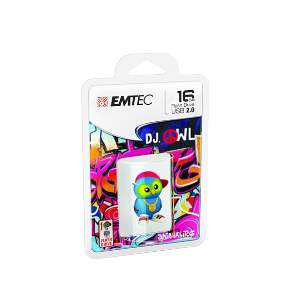 16GB EMTEC USB 2.0 FLASH DRIVE DJ OWL të Animalitos Family, me kapelen dhe varësen e tij të njohur. Model M341, produkt ekskluziv 3D, prodhuar me gomë të cilësisë së lartë. Ka sistem mbajtje për të mos lejuar humbjen e trupit.