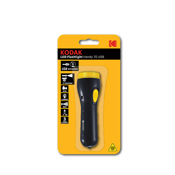 Elektriku i dorës Flash Handy 70 USB ka të inkorporuar bateri të karikueshme Litiumi18650 1200 mAh 3.7V dhe karikohet me fish USB. Ka dy mënyra ndriçimi: Njërën ballore me llampë 1W / 70 lumen dhe tjetrën në anësore me dritë UltraViolet për të kontrolluar nëse kartmonedhat janë origjinale apo të falsifikuara. Distanca e hedhjes së dritës: 40m. Kur është plotësisht i karikuar (koha e karikimit të plotë: 8-10 orë) punon për 3-5 orë. Shkalla e mbrojtjes nga agjentët atmosferikë: IP20. Prodhuesi ofron 3 vjet garanci. Është i paketuar në blister.