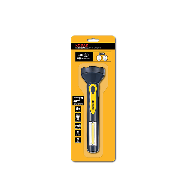 Elektriku i dorës Flashlight Work 120 USB ka të inkorporuar bateri të karikueshme Litiumi 3.7V 1200 mAh dhe karikohet me fish USB. Ka dy mënyra ndriçimi: Njërën ballore me llampë 3W / 120 lumen dhe tjetrën në anësore COB 1W LED / 90 lumen që mund të përdoret si llampë për lexim. Të dy ndriçimet janë 100% dhe kanë distanca të hedhjes së dritës: ballori 60m dhe anësori 10m. Kur është plotësisht i karikuar (koha e karikimit të plotë: 10-12 orë) punon për 3-4 orë në ndriçimim ballor dhe 5 orë në anësor. Shkalla e mbrojtjes nga agjentët atmosferikë: IP20. Prodhuesi ofron 3 vjet garanci. Është i paketuar në blister.