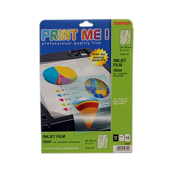 HAMA Film transparent profesional Inkjet format A4 (210 x 297mm) me trashësi 120 micron për printime me cilësi të lartë fotografie 1440dpi. Pako me 10 copë.