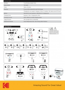 Kufje të cilësisë së lartë, pa tel dhe me Mikrofon. Ofrojnë cilësi të shkëlqyer tingujsh bass dhe treble. Ideale për tu përdorur në palestër, vrapim, ecje e kudo . Tapat e silikonit minimizojnë zhurmat e jashtme (3 lloje për të zgjedhur ato që përshtaten me veshin tuaj ). Mbas karikimit të plotë mbajnë deri 3 orë (me 50% te volumit). Prodhuesi ofron 2 vjet garanci.
